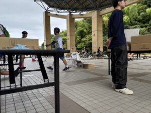 昼食ポイントのアクロス高松というスポーツ施設は大きなひさしがあり雨が降っても濡れません。ここで弁当を受け取りました。さっきセブンイレブンで、おにぎり2個食べてきて良かったと思いました。ここで50分ほど休憩になります。弁当を食べてもまだ時間があるのでゆっくり休みました。