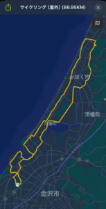 これが、今回走った経路です。海沿いを北上し、かほく市高松で折り返し、昼食会場に到着します。その後は、かほく縦貫道を南下し夢ミルク館で休息です。そこから先は平坦な道を走りスタート地点の会場にゴールしました。